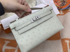 HERMES 22 Kelly pochette一代 稀有鸵鸟皮 手包晚宴包的首选,高级范 配上猪鼻子链子秒变小挎包哦 80 珍珠灰