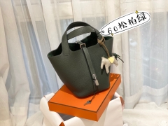 爱马仕女包价格 18菜蓝子picotin 进口TC皮 60松柏绿 金银扣