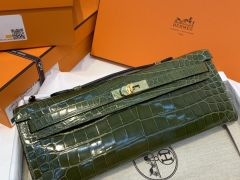 HERMES kelly cut 晚宴气质手拿包 绝对的贵妇必备! 亮光crocodile 鳄鱼 V6丛林绿 金扣