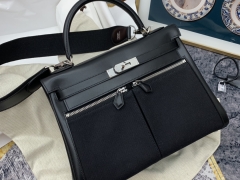 爱马仕 kelly lakis 32 双拉的设计显得更有当代感 前面增加两个口袋搭配精致的拉链 炸街简直轻而易举 通勤也是易如反掌 box皮拼帆布 黑银