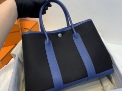 爱马仕 Gerdenparty花园包 30 黑色帆布拼明蓝 银扣 正品开版!