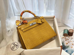 爱马仕 9D琥珀黄 银扣 kelly 28 亮光 nilo尼罗两点鳄鱼皮