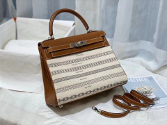 HERMES kelly 28 swift金棕拼帆布 银扣 低调内敛