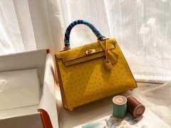 爱马仕 Kelly25 南非鸵鸟皮 Ostrich 9O那不勒斯黄 金扣 蜡线全手工 鸵鸟皮越用越有光泽
