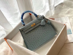 Kelly25 南非鸵鸟皮 Ostrich 8U冰川蓝 金扣 蜡线全手工 鸵鸟皮越用越有光泽