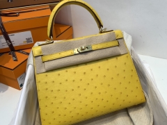 HERMES kelly 25cm 南非kk鸵鸟皮ostrich 总能虏获一众时尚人士的青睐!上身只能“高级”两字来形容 9D 琥珀黄 金扣