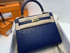 HERMES kelly 25cm 南非kk鸵鸟皮ostrich 总能虏获一众时尚人士的青睐!上身只能“高级”两字来形容 73-宝石蓝 金扣