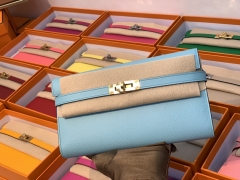 HERMES 新到现货~ kelly 长款钱包 鸵鸟皮ostrich 冰川蓝 银扣